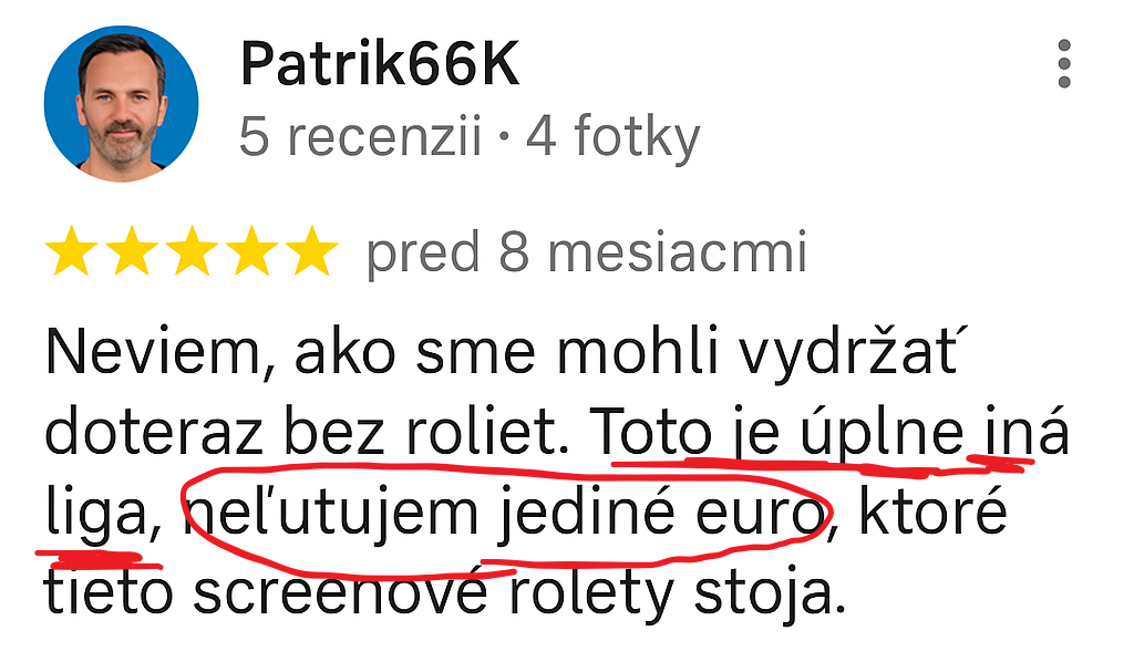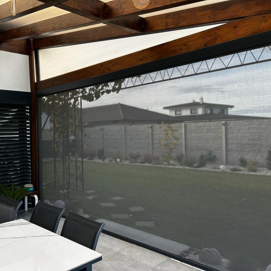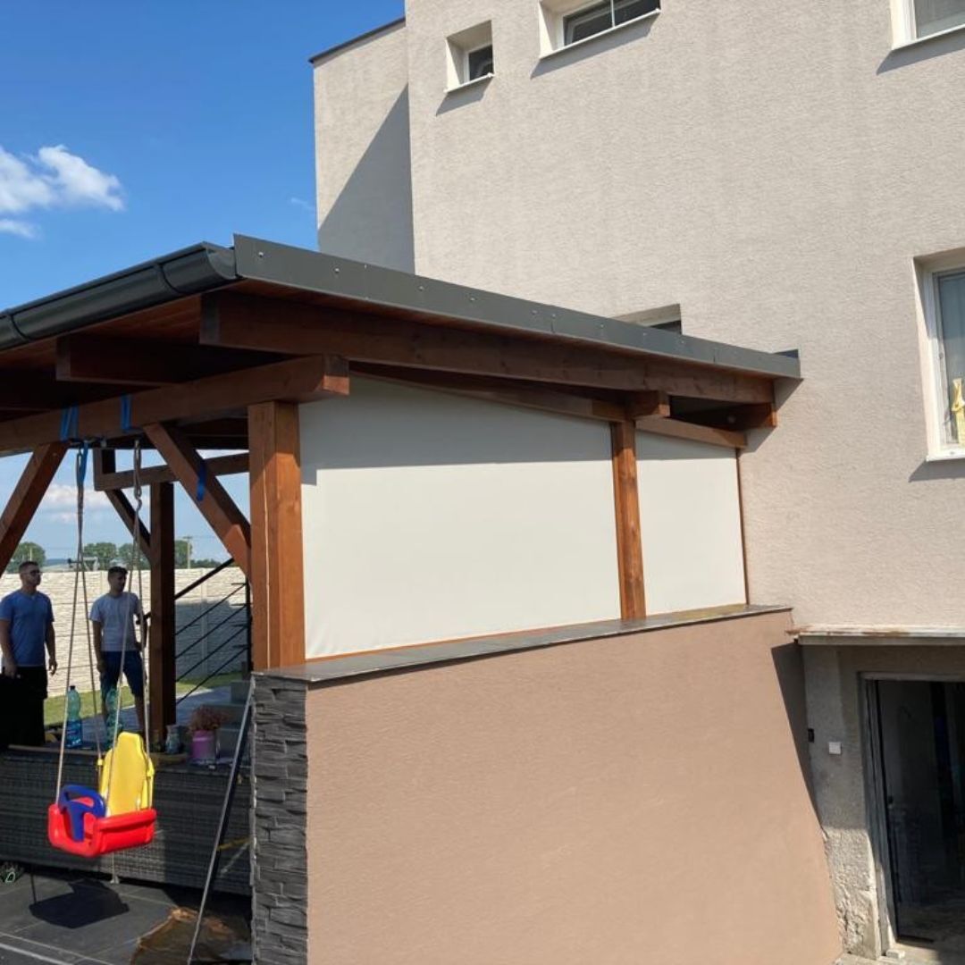 Preto používame pevné hliníkové profily, ZIP vedenie, UV stabilné tkaniny, značkové motory a nerezové prvky. Výsledkom je produkt, ktorý drží tvar, funguje stabilne aj pri poryvoch a vydrží roky pri správnej údržbe.